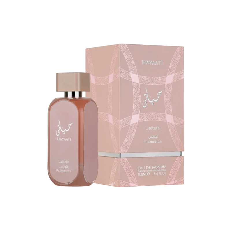 Hayaati Florence é um Eau de Parfum Feminino da Lattafa, classificado como Floral Frutado Gourmand. É uma fragrância vibrante, doce e elegante, centrada na combinação suculenta de Lichia e Toranja com um coração de Rosa e Pêssego, finalizando com a cremosidade da Baunilha e do Pralinê. É ideal para o uso diário, especialmente na primavera e no verão.