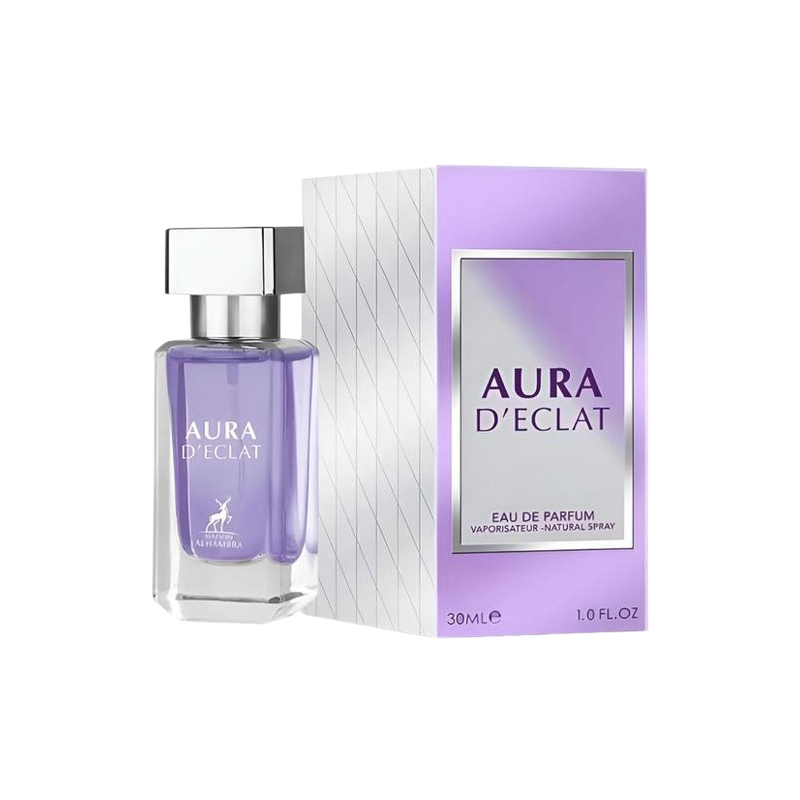 Aura D'Eclat é uma fragrância floral verde, elegante e luminosa da Maison Alhambra. É uma interpretação fresca e suave que evoca uma sensação de limpeza e leveza. A combinação de notas de lilás, chá verde e peônia oferece um frescor floral etéreo e radiante, enquanto o fundo de almíscar e cedro proporciona uma base limpa e amadeirada sutil, ideal para o uso diário ou em climas quentes.